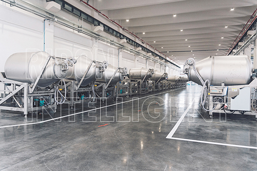 Det totala fabriksområdet i ribon är 60000 kvm Och produktionsområdet är 36000 kvm . Vi har monteringsarbetsstationer för 60 st av 1700L-3500L vakuumtumblers och 30 st av 4-8 Trolley SmokeHouse, som kan monteras samtidigt.
